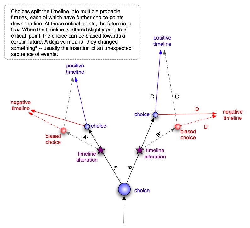Synchronicities, prophetic dreams, inner gnostic insight, etc... are inputs from outside the timeloop. The more you become aware of these outer influences, the more likely you will act contrary to the default pathway carved by the timeloop. These are the "B" influences, compared to "A" influences that keep you in you current timeloop. Timeloops begin and end with choice...the less freewill one employs, the more stuck one will be.
